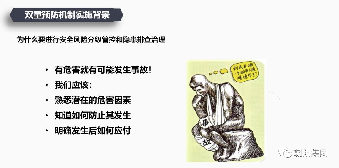 在培訓(xùn)活動中,朝陽集團(tuán)申總詳細(xì)給員工講解了風(fēng)險(xiǎn)分級管控、隱患排查治理的概念、方法和流程等,并強(qiáng)調(diào)了雙重預(yù)防機(jī)制在安全生產(chǎn)中的重要性。申總首先對雙重預(yù)防機(jī)制的定義進(jìn)行了闡述,再對風(fēng)險(xiǎn)分級管控與隱患排查治理的雙重預(yù)防機(jī)制進(jìn)行了深入的講解。